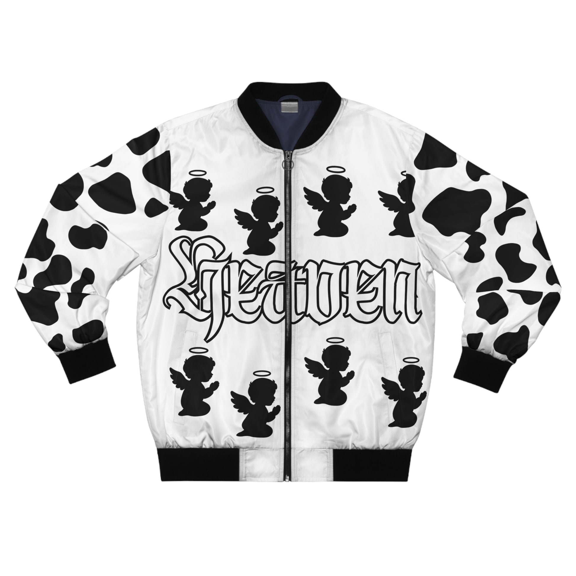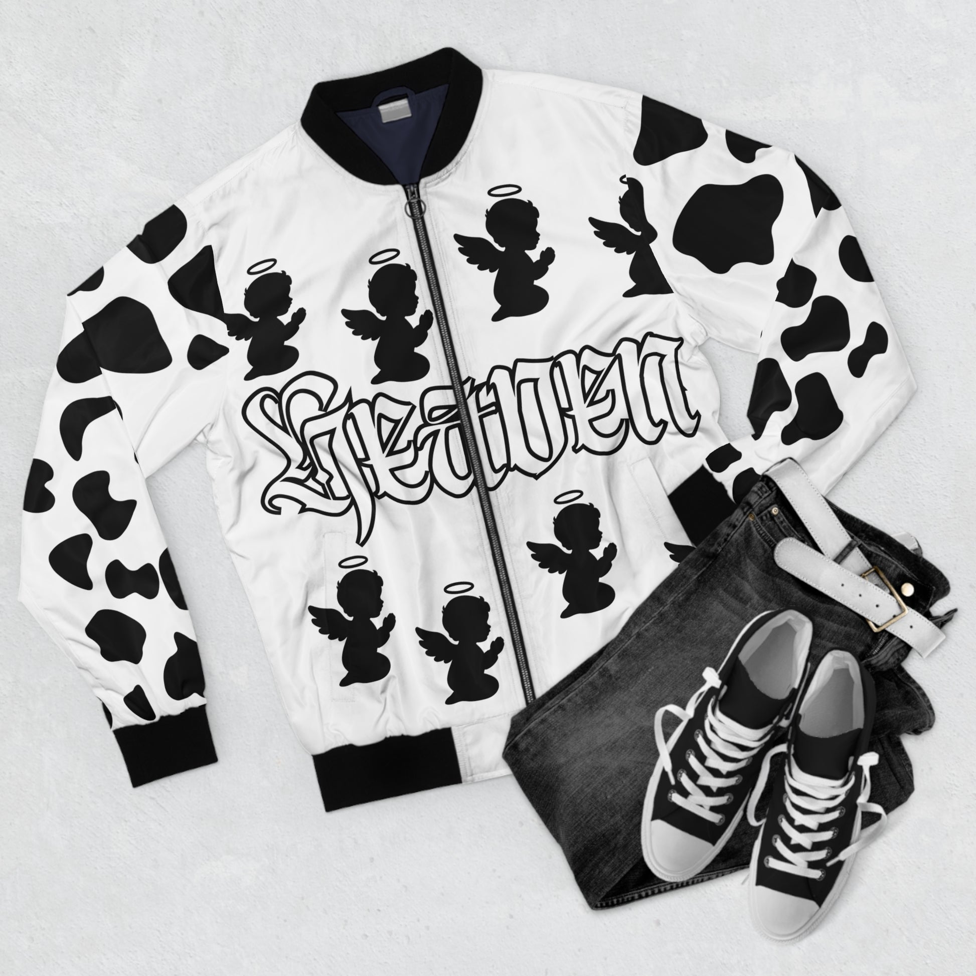 This bomber jacket brings bold black-and-white. Angel and cherub,layered with gothic lettering that reads “Heaven” and a vintage-inspired central cherub on the back. Cow-print patches add an unexpected, edgy contrast while black rib-knit cuffs, collar and hem frame the silhouette. The all-over print gives the design full coverage, and the durable polyester build stands up to wind and light rain. Wear it when you want your outer layer to speak — whether you’re walking city blocks at dusk, layering for a late-night show, or adding attitude to a casual meet-up.