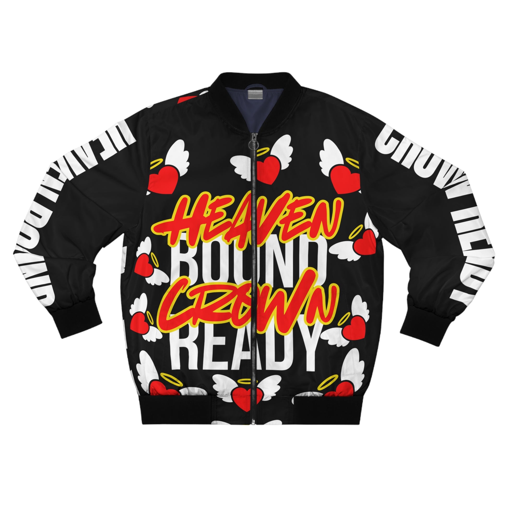 A bold, statement bomber that wears its heart on the sleeve — and across the chest. This all-over printed jacket places chunky, winged hearts against a deep black field, while bright, graffiti-style lettering reads Heaven Bound Crown Ready in red and gold. The rib-knit collar, cuffs and hem add a classic bomber silhouette and a snug fit. It’s the kind of outerwear that turns ordinary commutes into moments of self-expression. Wear it when you want to feel seen, when you’re heading out to a late-night show, or when you need a confident layer for city streets and crowd-filled events. The jacket’s strong polyester shell holds the vibrant print and resists wind and light rain, while the lined pockets and full metal zipper give practical comfort on the move.