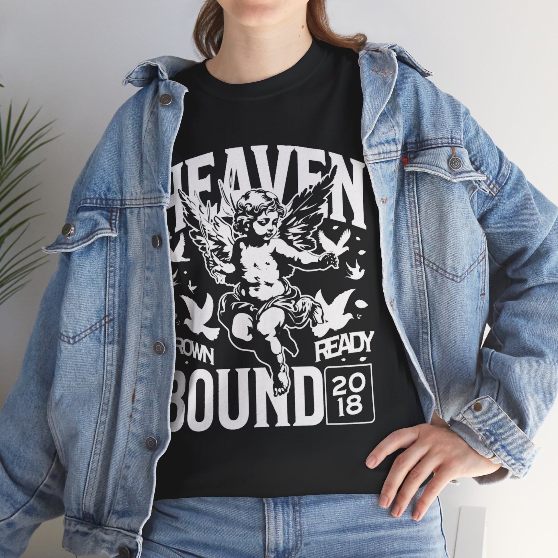 A bold, vintage-inspired tee made to carry meaning beyond its cotton. This classic crew neck features a striking monochrome graphic of an angelic figure framed by doves and the words “HEAVEN BOUND” with a subtle date block — a design that reads like a personal emblem or a keepsake from an important moment. The shirt hangs relaxed and confident, so it layers easily under a jacket or stands alone as a statement. Wear it to remember, to honor, or simply to add an edge of reverent style to everyday outfits.